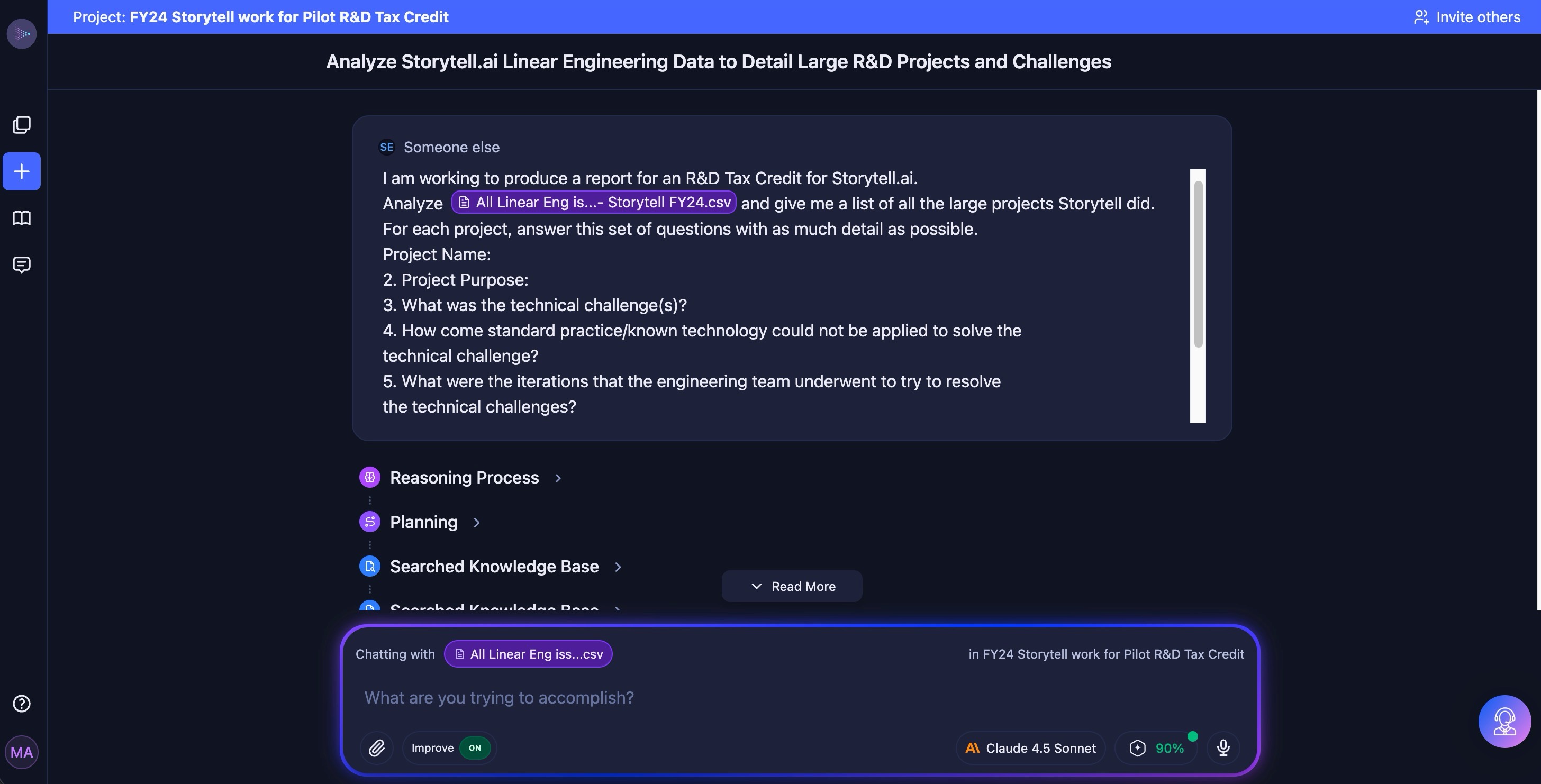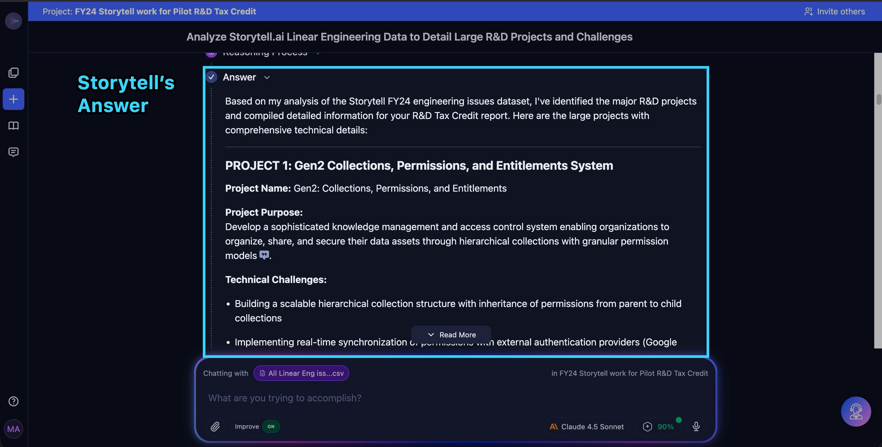 We began by uploading a CSV export of all our FY24 Linear engineering tickets to Storytell. Instead of crafting the perfect prompt, our R&D tax credit consultant started with a direct, structured question to get what was needed for the tax credit report: