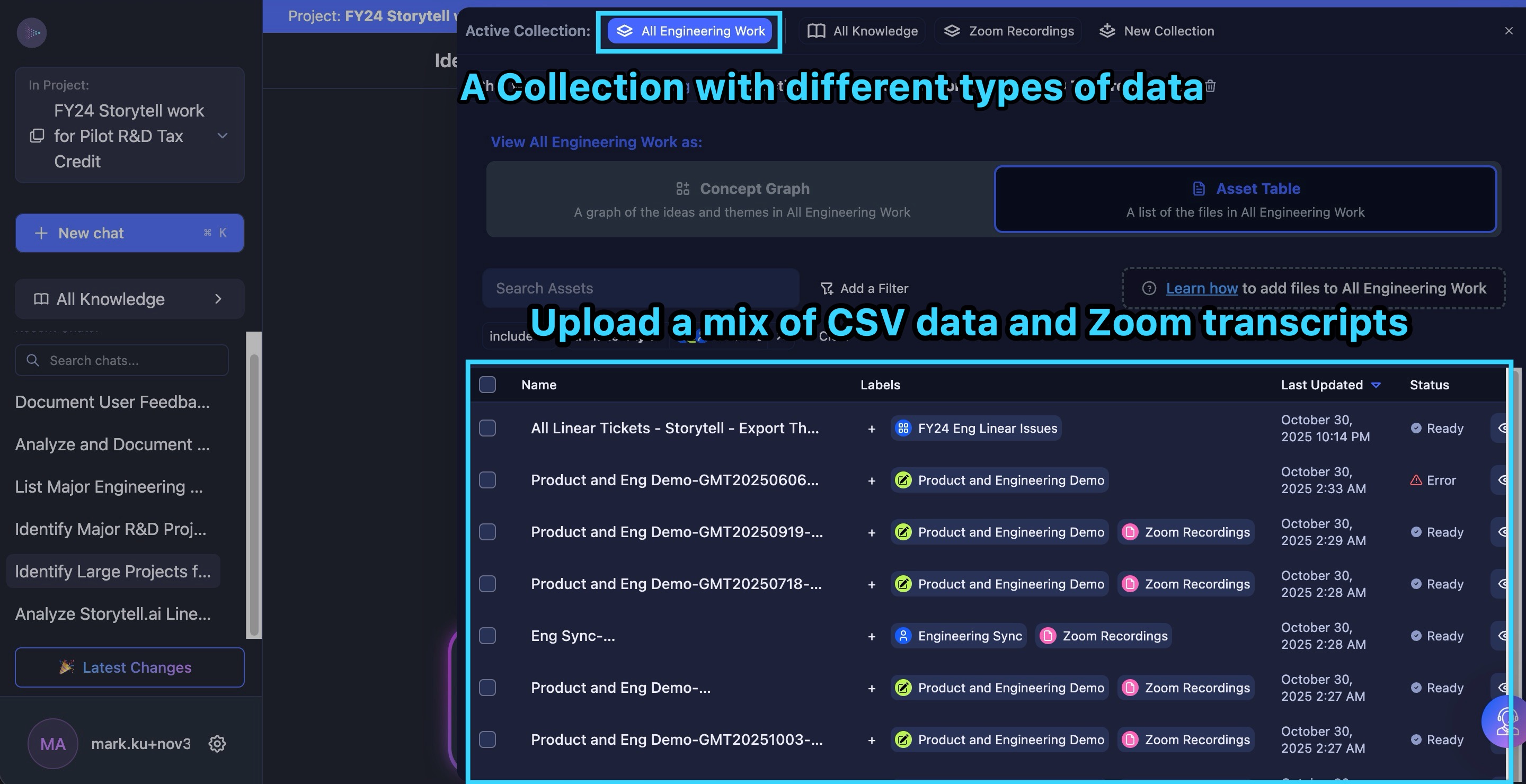 Traditional data analysis tools can't combine these data types—CSV files and video transcripts are fundamentally different formats. But Storytell handled both seamlessly. We created a unified "view" called "All Engineering Work" that encompassed both the Linear tickets and the Zoom transcripts.