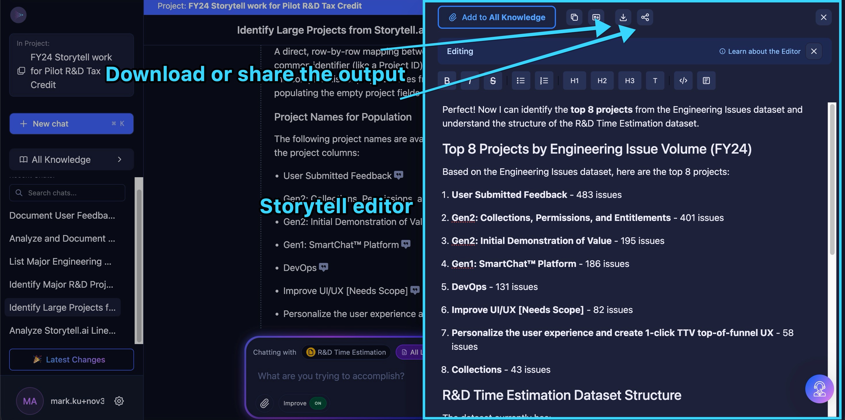 Within minutes, Storytell analyzed all 1,808 issues across 53 distinct projects, identified eight "large" projects with more than 50 associated engineering issues, and generated detailed technical documentation for each.