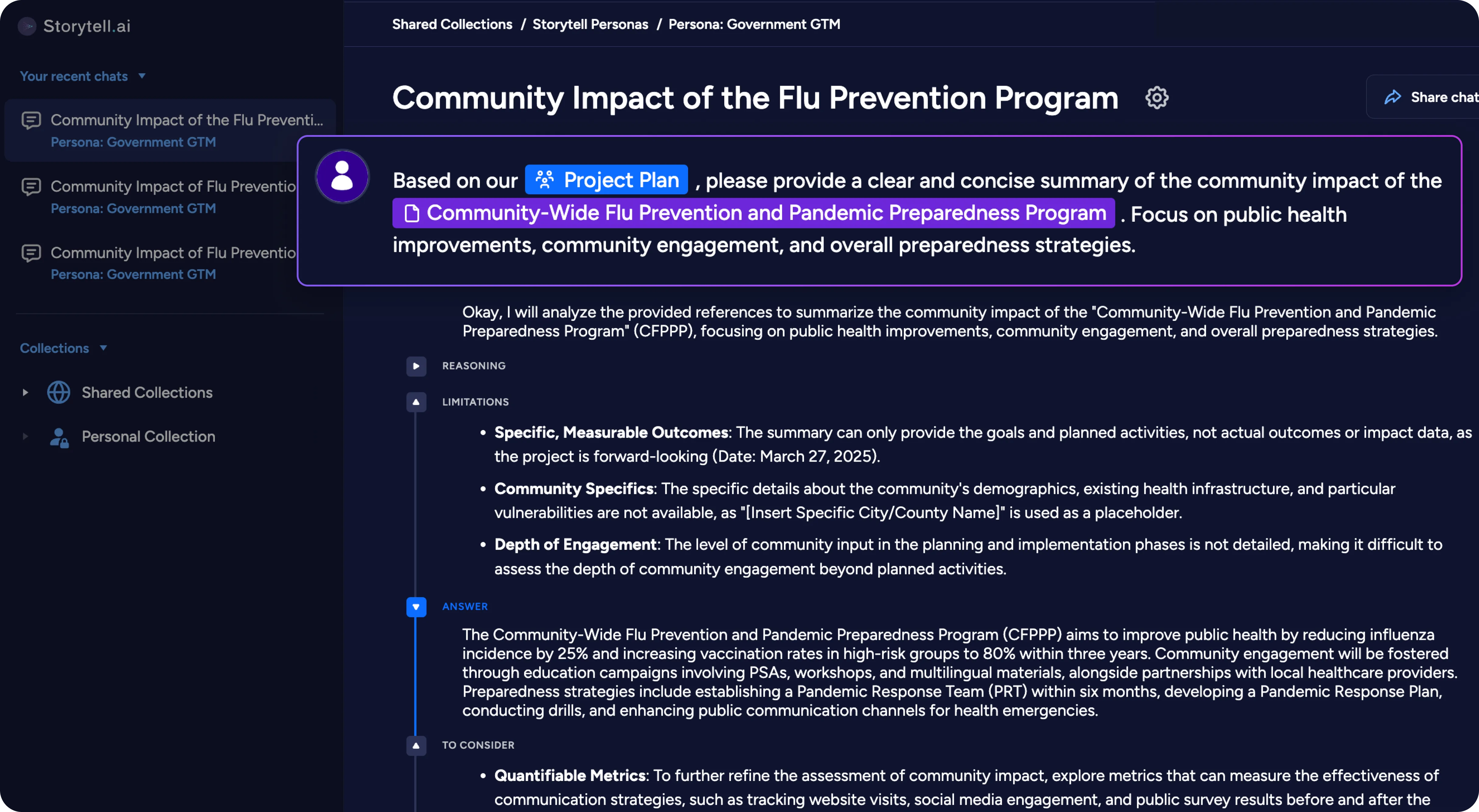 Storytell provides transparent reasoning, showing you the steps it took to arrive at its responses. Understand the reasoning process, potential biases ("Gotchas"), and explore deeper analysis ("Consider") so you’re always confident in your data.